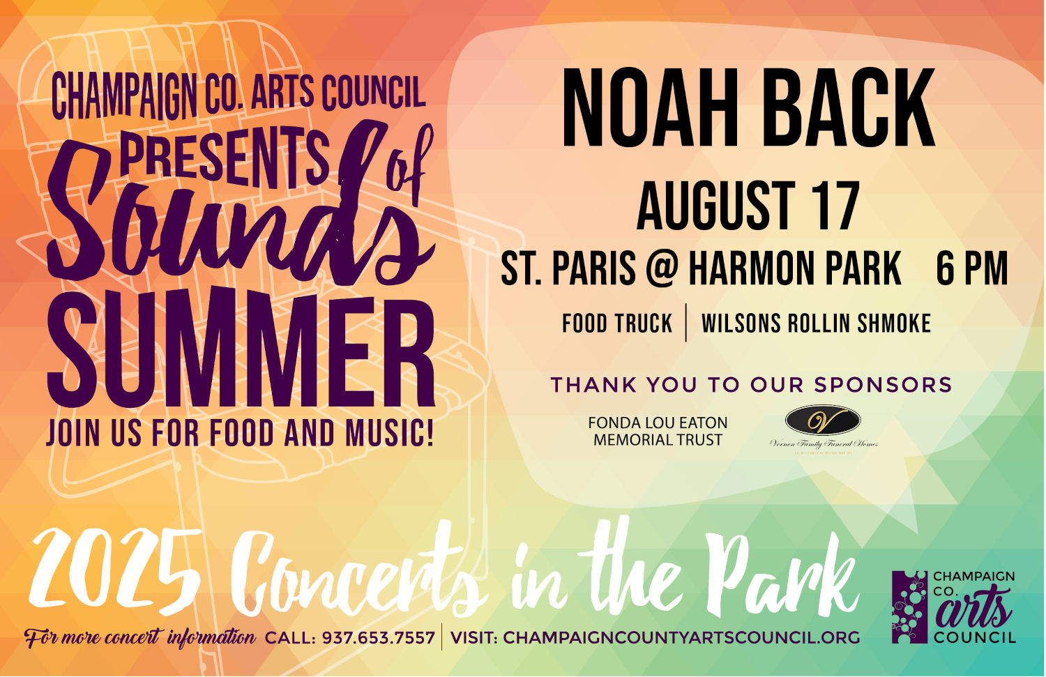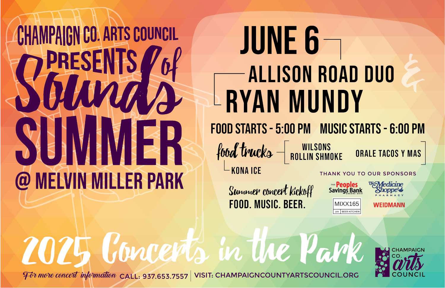 The 2025 "Sounds of Summer" series kicks off on June 6th with Allison Road Duo and Ryan Mundy at Melvin Miller Park in Urbana. On August 17th, Noah Back will perform at Harmon Park in St. Paris.